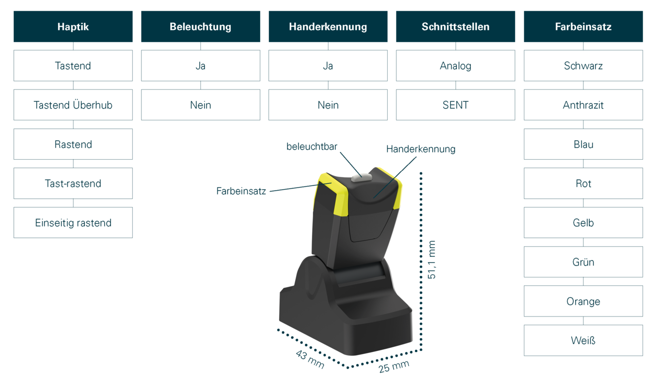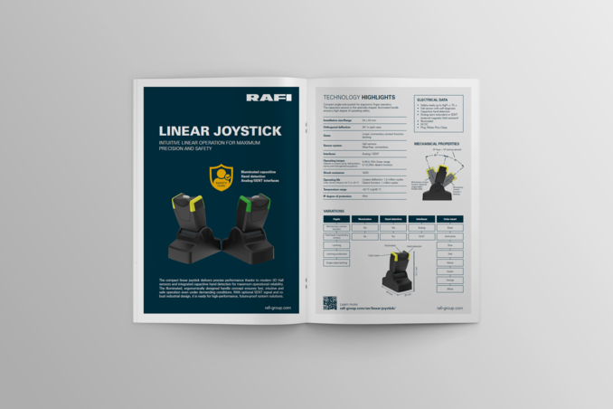 Der kompakte Linear Joystick liefert präzise Performance dank moderner 3D Hall Sensorik und integrierter kapazitiver Handerkennung für maximale Betriebssicherheit. Das beleuchtbare, ergonomisch ausgelegte Griffkonzept sorgt für eine schnelle, intuitive und sichere Bedienung auch unter anspruchsvollen Bedingungen. Mit optionalem SENT Signal und robuster Industrieauslegung ist er bereit für leistungsstarke, zukunftssichere Systemlösungen.